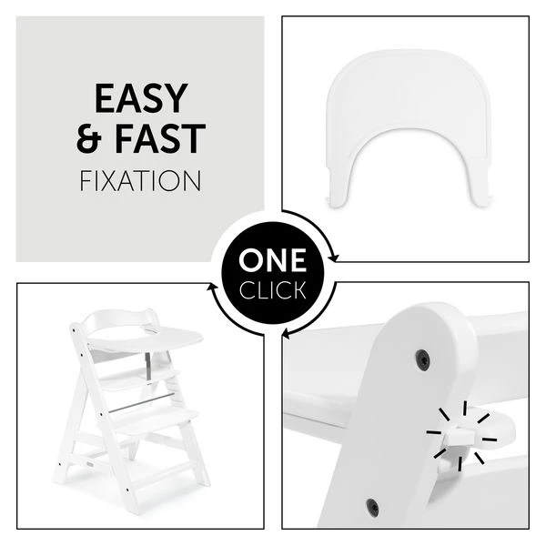 Das Alpha Click Tray ist eines der Accessoires, das zum hauck Alpha+ Hochstuhl passt und jederzeit ergänzt werden kann. Durch sein einfaches Klick-System wird der Tisch am Alpha+ Holzhochstuhl mit nur einer Hand schnell, einfach, ohne Werkzeuge befestigt. So wird der mitwachsende Holzhochstuhl für dich und dein Kind bei jeder Mahlzeit noch flexibler.