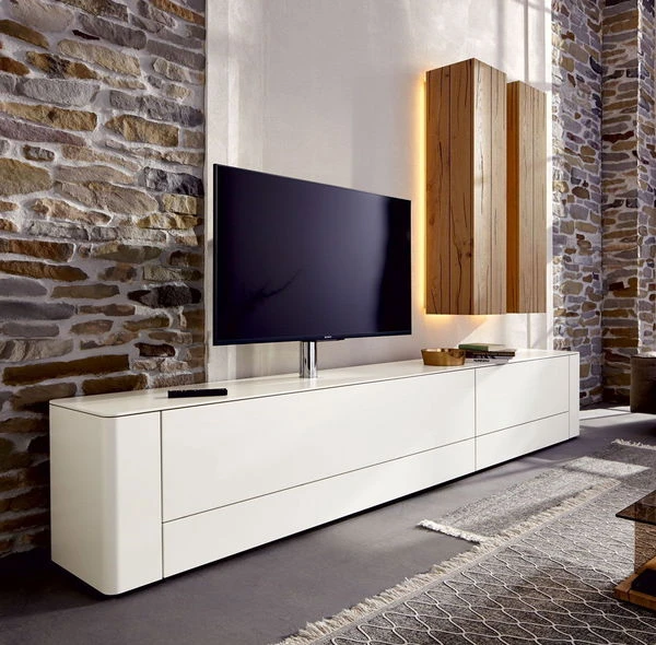 Die gerundeten Elementabschlüsse des Lowboards können gegen Aufpreis wahlweise mit Auszügen oder Drehtüren ausgestattet werden. Bei den Drehtüren muss der seitliche Abstand 27 cm (je Tür) betragen, um die Türen vollständig öffnen zu können.