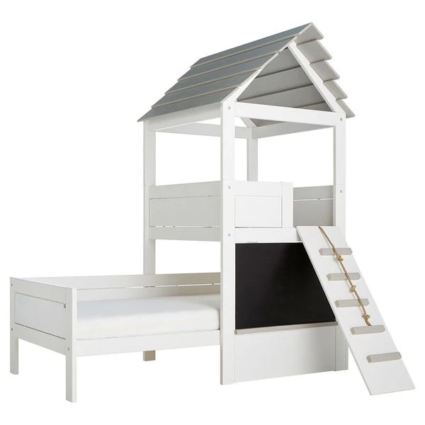 Das LIFETIME Play Tower Bett ist aus massiver astfreier Kiefer hergestellt. Dadurch treten keine Verfärbungen auf, die man von Astlöchern her kennt. Die Oberfläche ist mit einem weißen Möbellack auf Wasserbasis behandelt worden.
