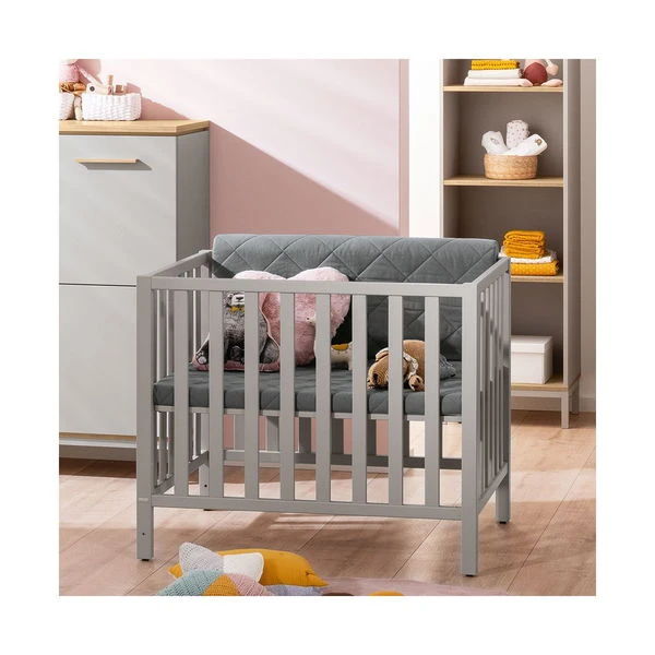 Das Kuschelpolster wird über eine Gitterseite von Scotty gelegt und bietet einen kuscheligen Farbtupfer. An der Rückseite sind praktische Taschen für Spielzeug o.ä. angebracht.