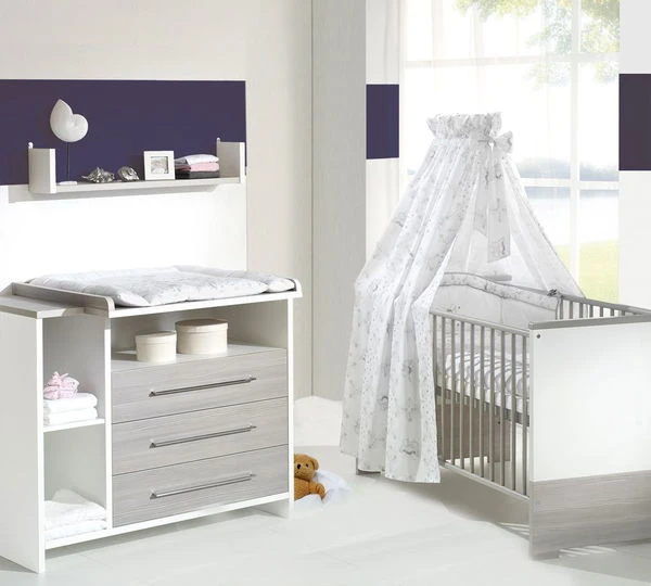 Die Kinderzimmer-Serie ECO gibt es jetzt auch neu in dezenter klassischer Farbgebung weiß/silber. Ein eleganter Blickfang sind die langen Chrom-Griffleisten, die ein leichtes Öffnen und Schließen ermöglichen. Die helle Farbgebung sorgt für eine fröhliche Atmosphäre und garantiert süße Babyträume. Seitenregale schaffen zusätzliche Ablageflächen für praktische Dinge des Alltags.