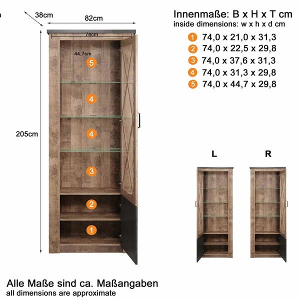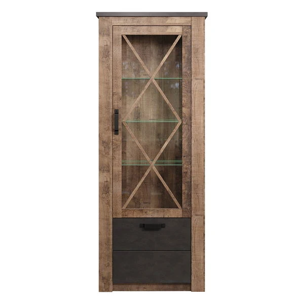 Die trendteam Georgia Standvitrine ist eine stylishe Lösung für Stauraum, ohne zu viel Stellfläche einzunehmen. Die verwendete Dekorfolie verschafft der Oberfläche Langlebigkeit. Das Design kennzeichnet der Korpus im Tabak Eiche und Matera Dekor, wodurch es fabelhaft zu Ihrem weiteren Mobiliar passt. Schwarzfarbene Griffe gliedern sich farblich hervorragend in das Dekor ein.