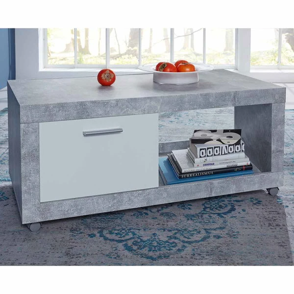 Der trendteam Universal Couchtisch auf Rollen überzeugt nicht nur mit seiner trendigen Aufmachung, sondern passt wahrlich in jedes Zimmer. Das Design kennzeichnet der Korpus im Beton Stone Dekor, wodurch es fabelhaft zu dem übrigen Mobiliar passt. Vervollständigt wird das Dekor durch silberfarbene Griffe. Eine optimale Beständigkeit wird durch die Anwendung von Melamin garantiert.